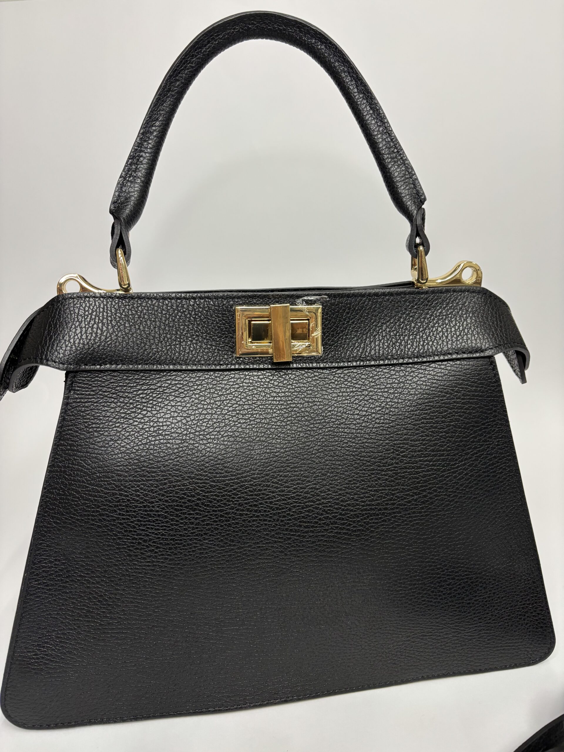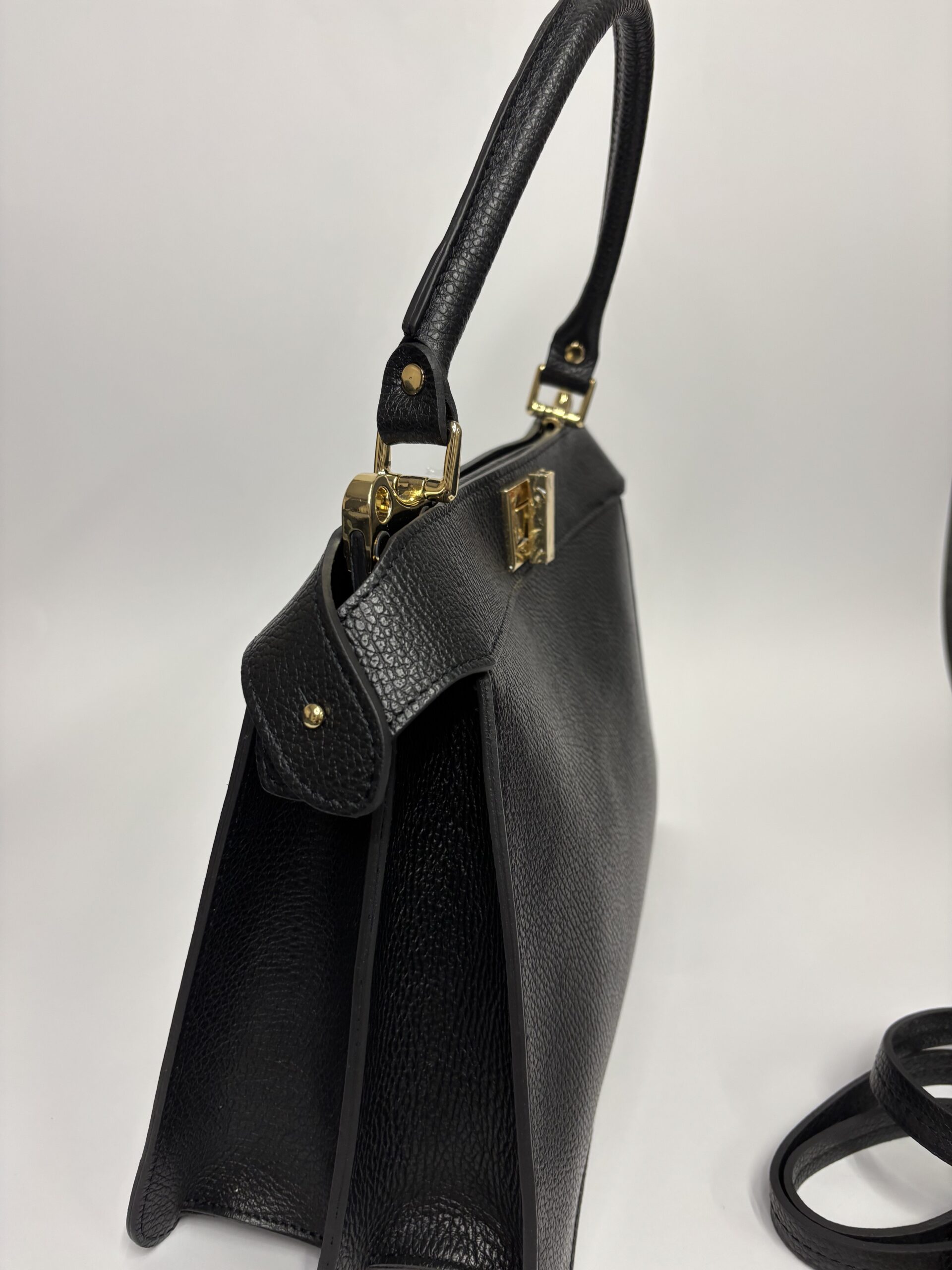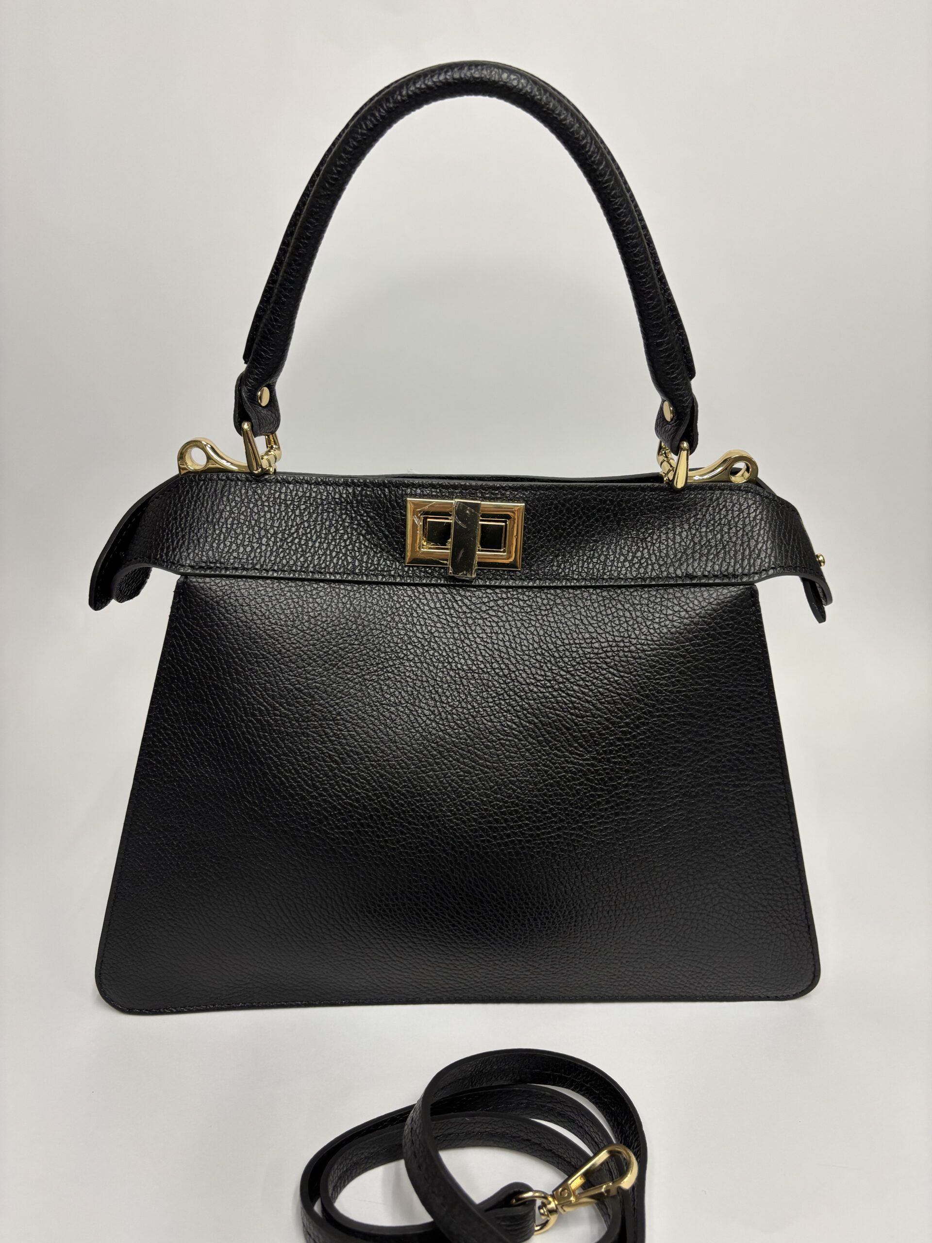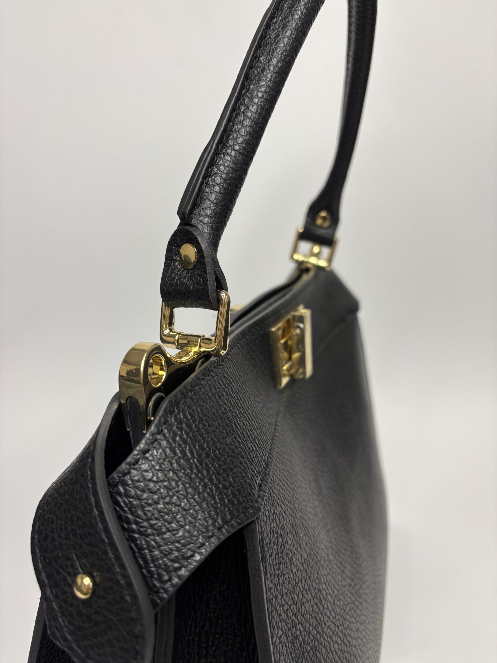 Luksuzna postava od fine tkanine, zlatni detalji i podesiva, uklonjiva kožna naramenica upotpunjuju njen raskošan karakter.